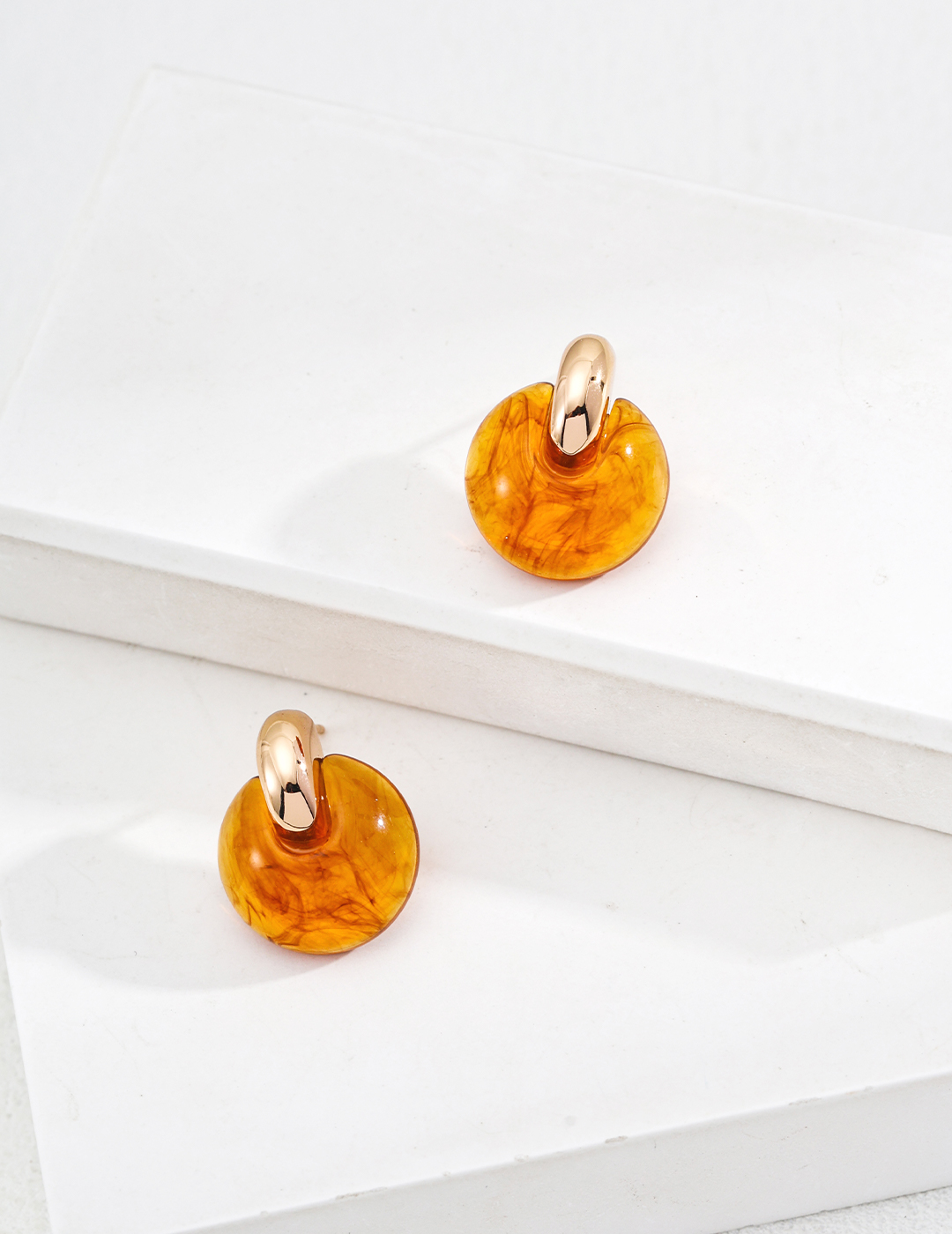 Product design: The earrings are made of high-quality high-tech amber material, with warm color and delicate texture. The clever embellishment of the gold metal ring not only enhances the overall exquisiteness, but also reveals a noble and elegant atmosphere in the details.